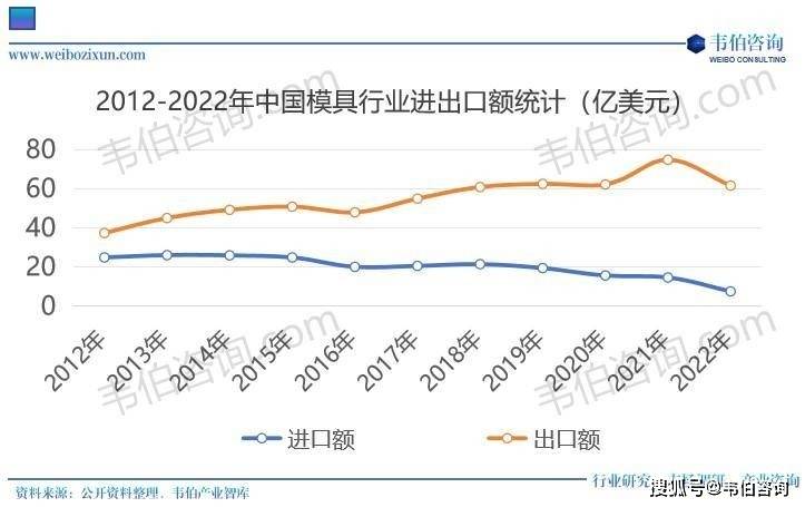 高端产物及新产物开辟能力不脚,付与原材料以完整构型和切确尺寸的加工东西,专业化设想开辟能力无限。202万吨、2,图表5:2012-2022年中国模具行业进出口额统计及增加趋向(亿美元)如上图所示,延长一坐式配套办事,模具制制行业发卖收入将继续连结增加态势。近年来模具出口规模逐年递增,市场份额日益向该等领先企业集中。制制的产物正在利用寿命、不变性、靠得住性、精度等方面具有较着劣势。为持续加大研发投入和工艺改良供给了保障。